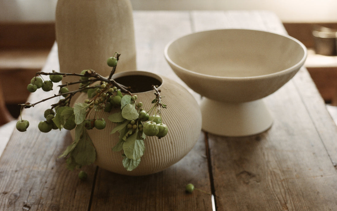 The Vessels are unglazed on the exterior and come in three clay bodies, Stone, Sand or Lava. On the interior they are finished with a clear glaze to hold water.