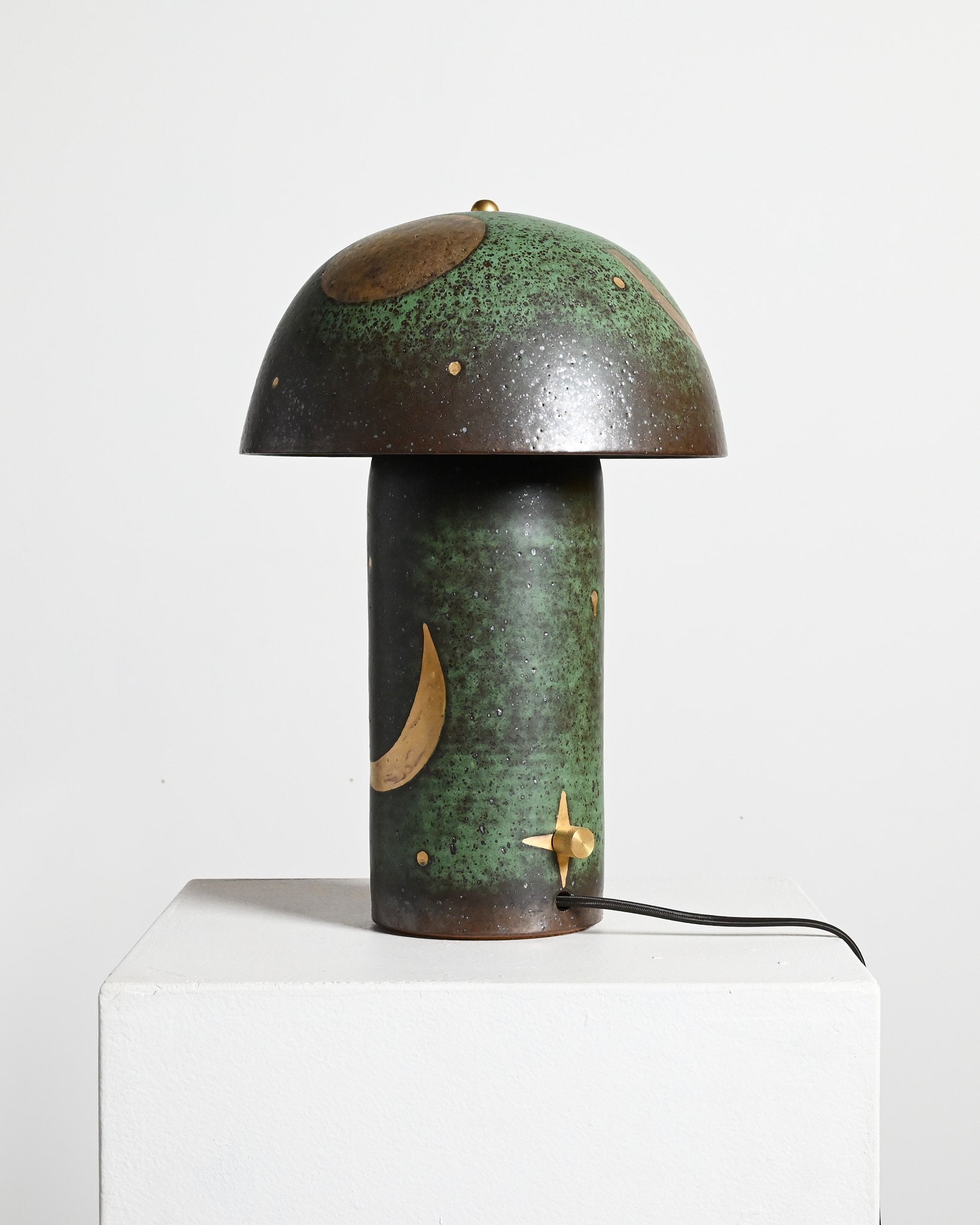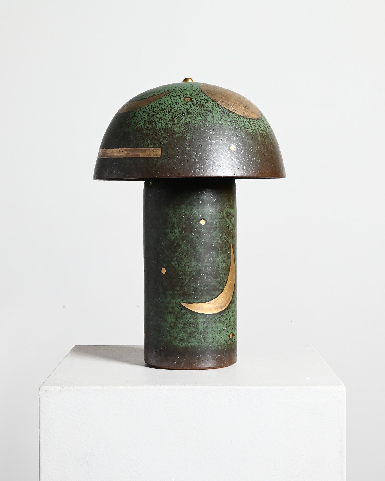 Each lamp is carved by hand and glazed in a matte, green to black glaze. Once the pieces have been glaze, each lamp is hand painted with a gold luster and they undergo a unique third firing in the kiln, resulting in a layer of 18k gold.
