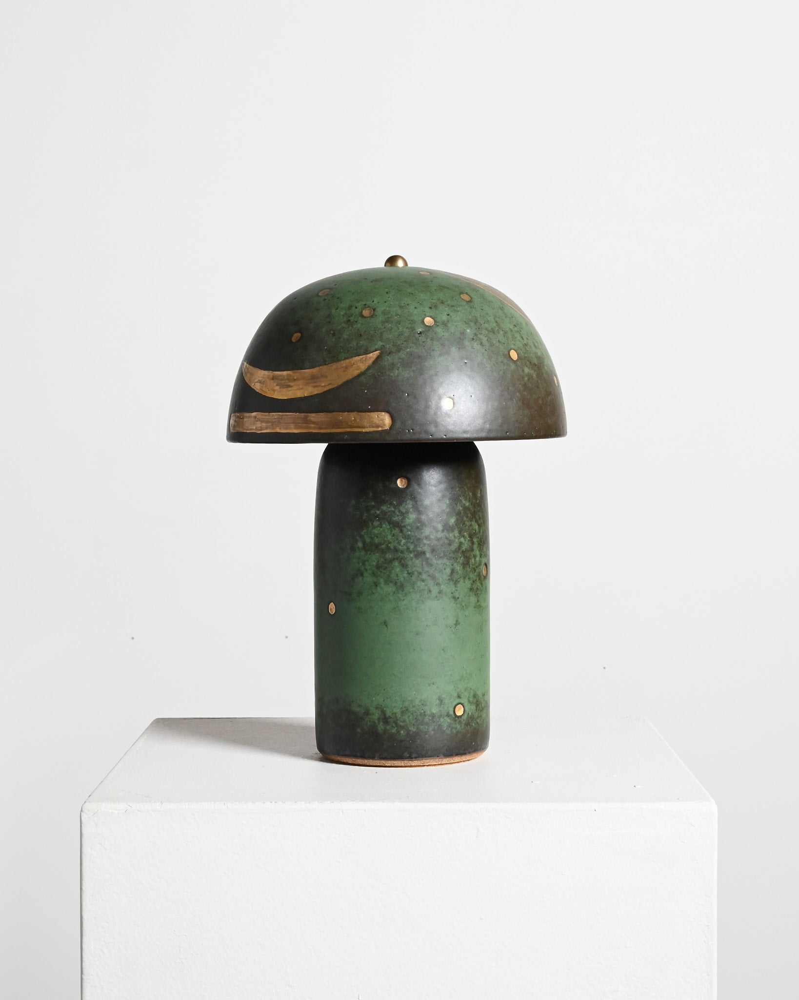 Each lamp is carved by hand and glazed in a matte, green to black glaze. Once the pieces have been glaze, each lamp is hand painted with a gold luster and they undergo a unique third firing in the kiln, resulting in a layer of 18k gold.