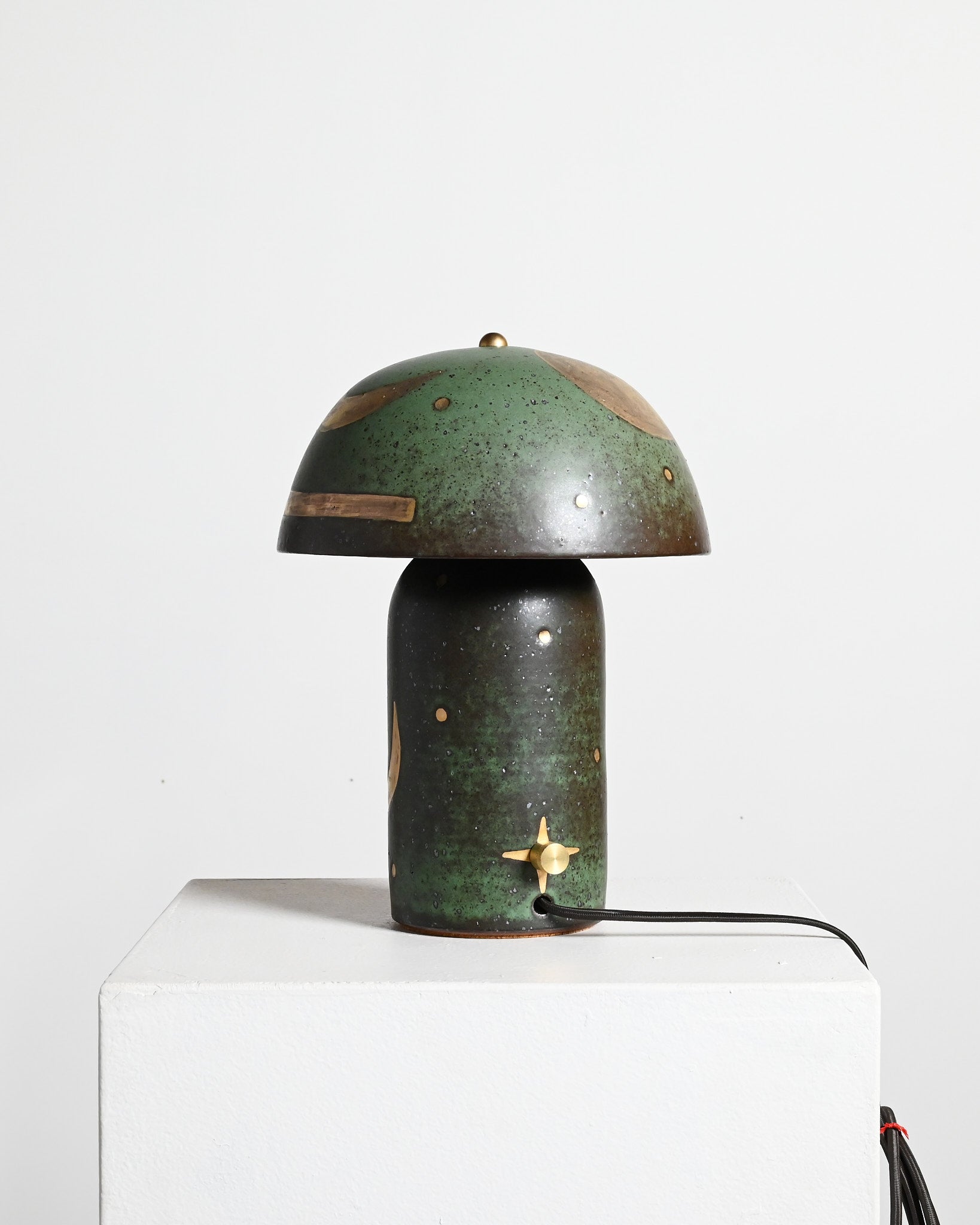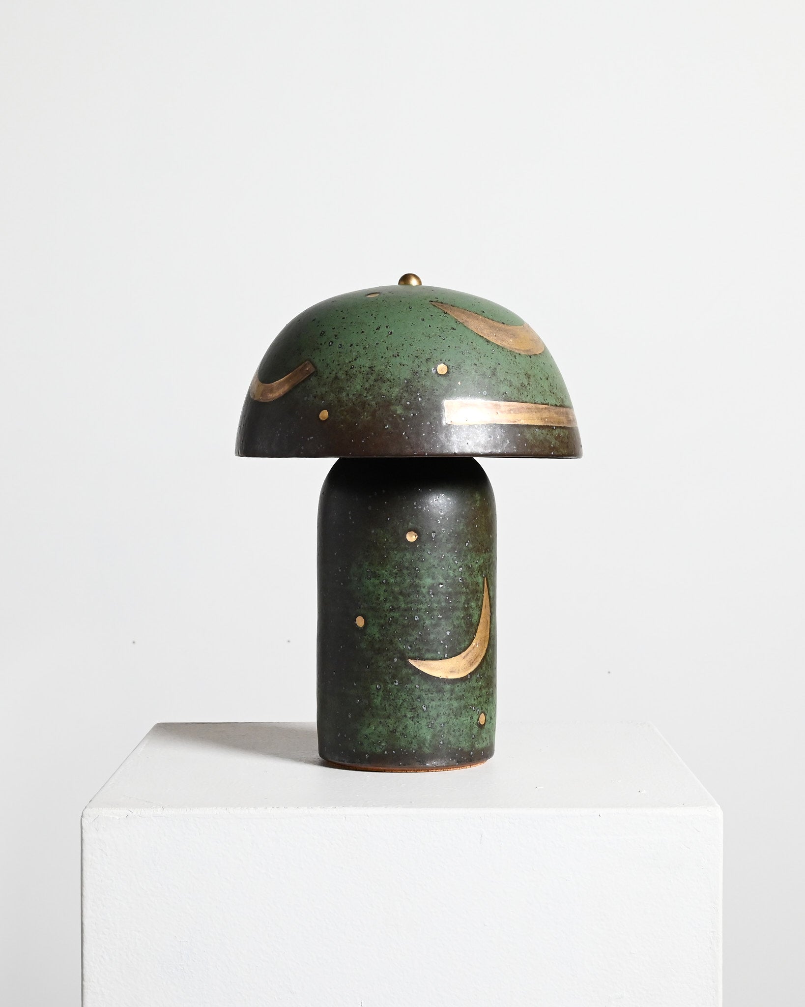 Each lamp is carved by hand and glazed in a matte, green to black glaze. Once the pieces have been glaze, each lamp is hand painted with a gold luster and they undergo a unique third firing in the kiln, resulting in a layer of 18k gold.