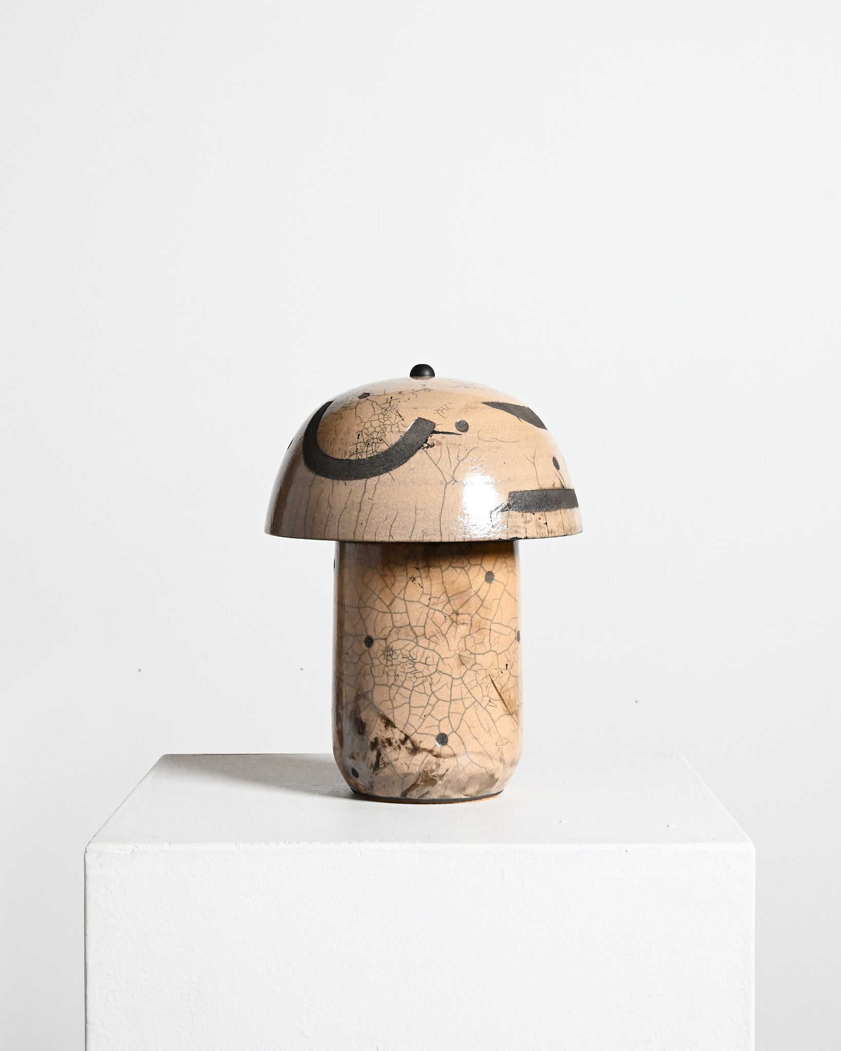 This is 1 of 2 lamps in the collection that was glazed with a White Crackle Raku glaze. The lamp was made using a red clay which gives the lamp a dusty pink color, and the carved designs were left unglazed which allows the clay to absorb the smoke during the Raku process, turning the clay black.