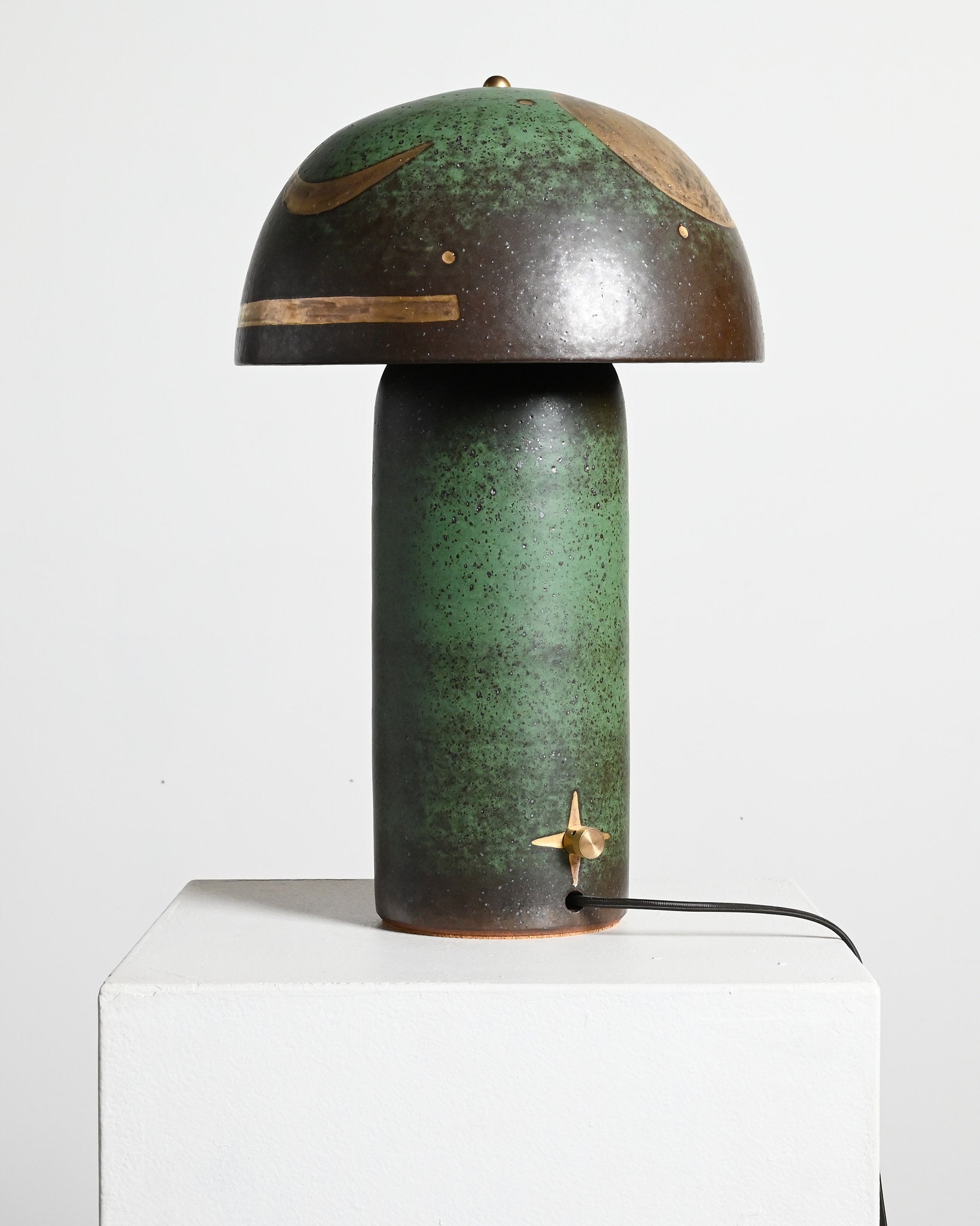 Each lamp is carved by hand and glazed in a matte, green to black glaze. Once the pieces have been glaze, each lamp is hand painted with a gold luster and they undergo a unique third firing in the kiln, resulting in a layer of 18k gold.