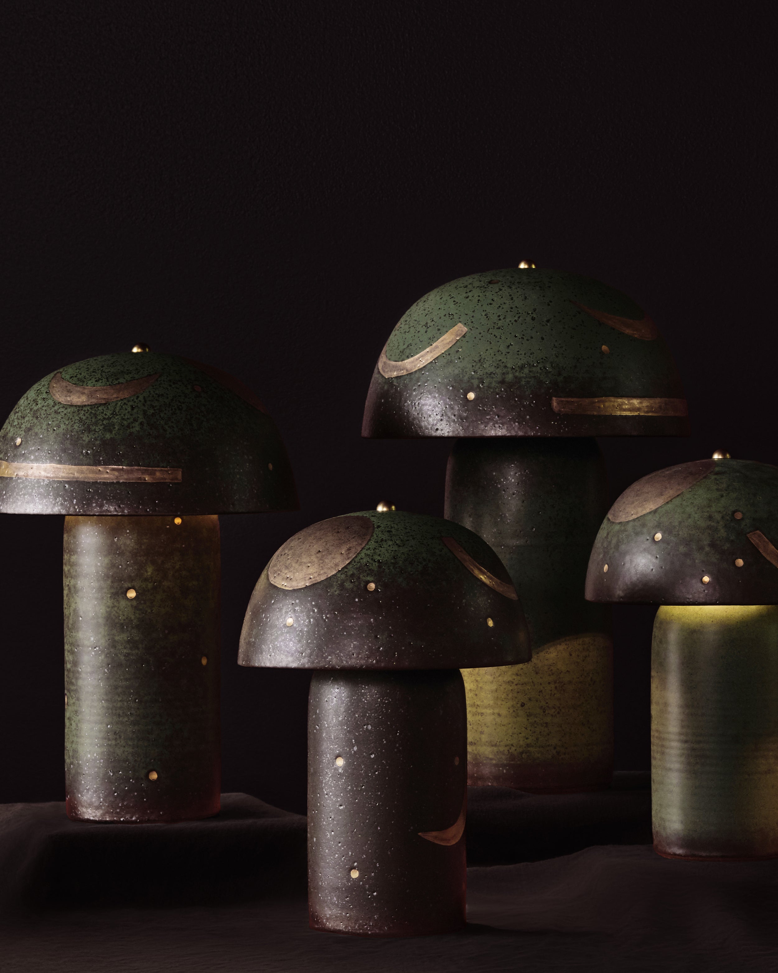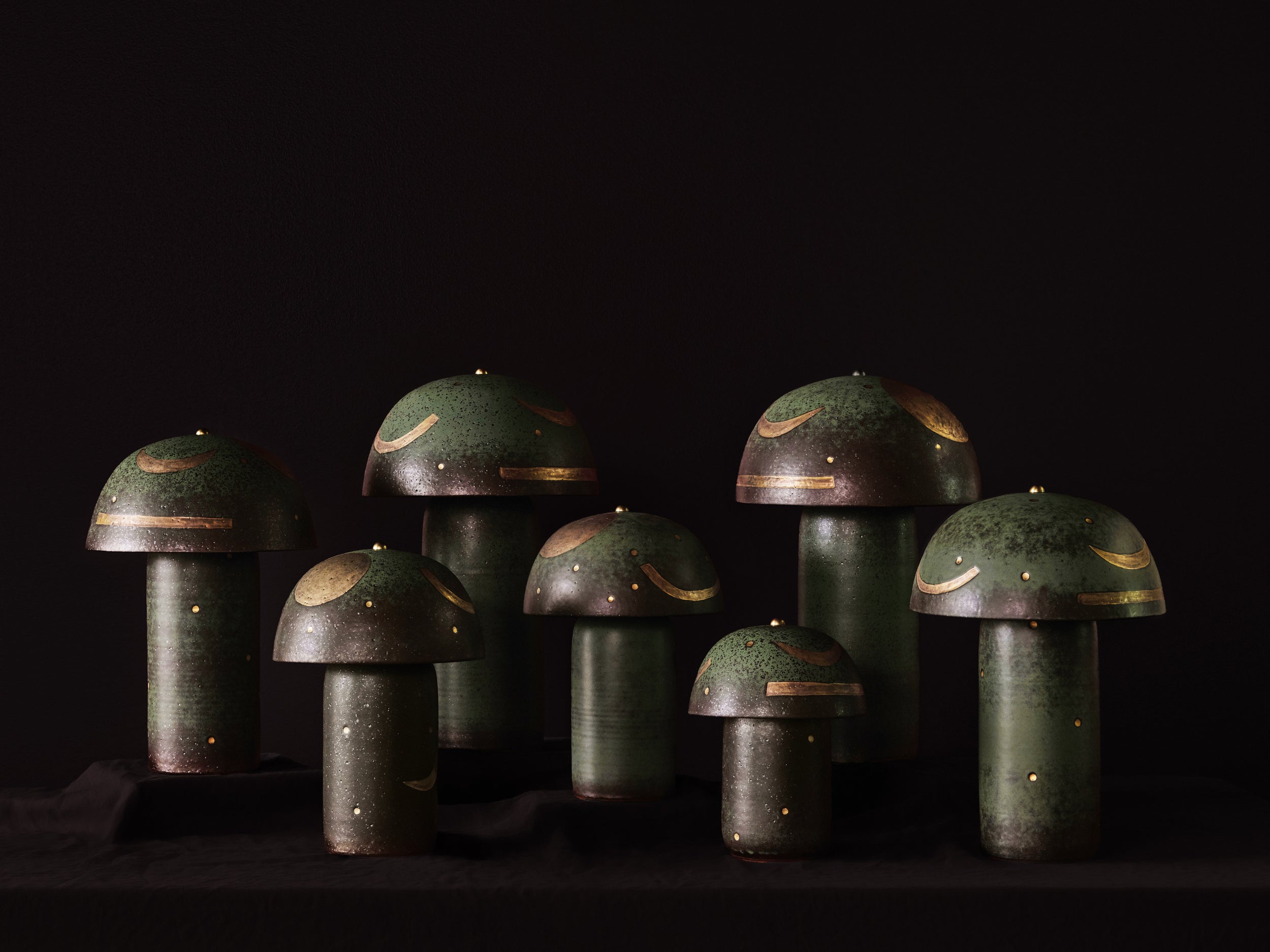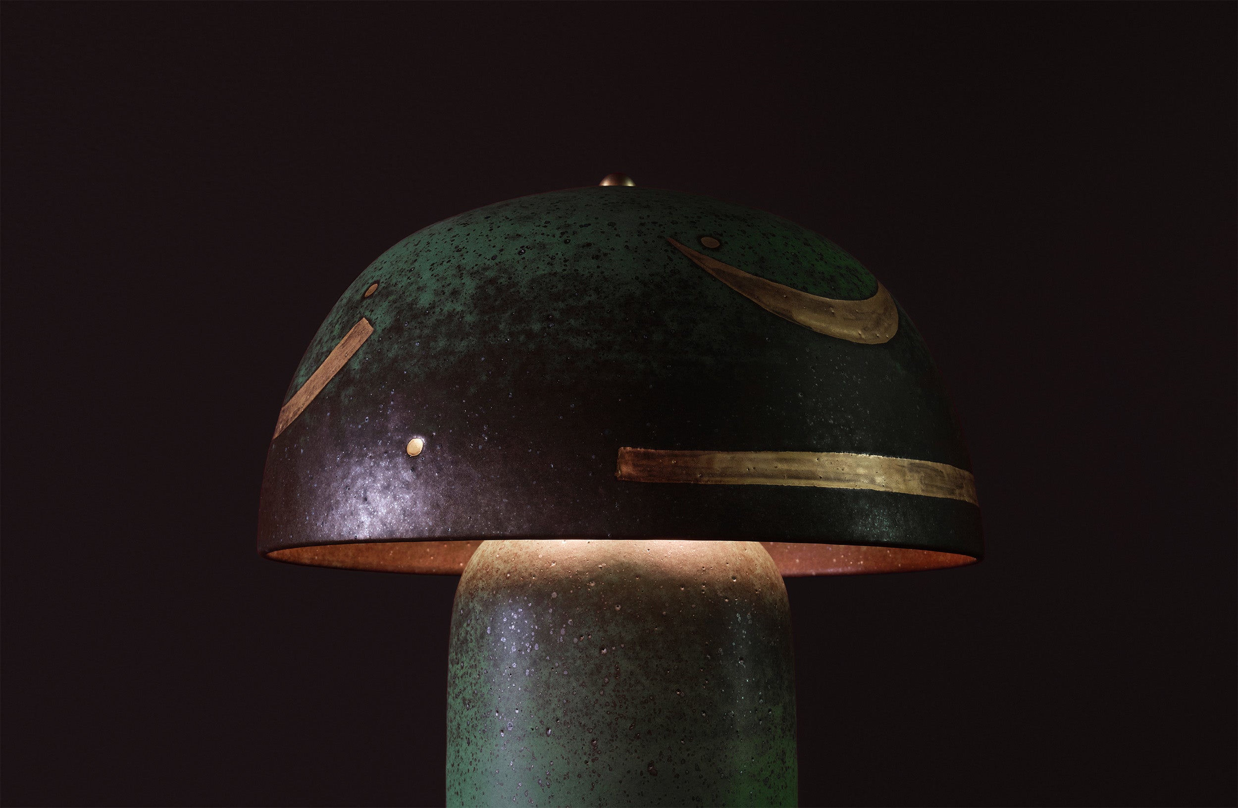 Each lamp is carved by hand and glazed in a matte, green to black glaze. Once the pieces have been glaze, each lamp is hand painted with a gold luster and they undergo a unique third firing in the kiln, resulting in a layer of 18k gold.