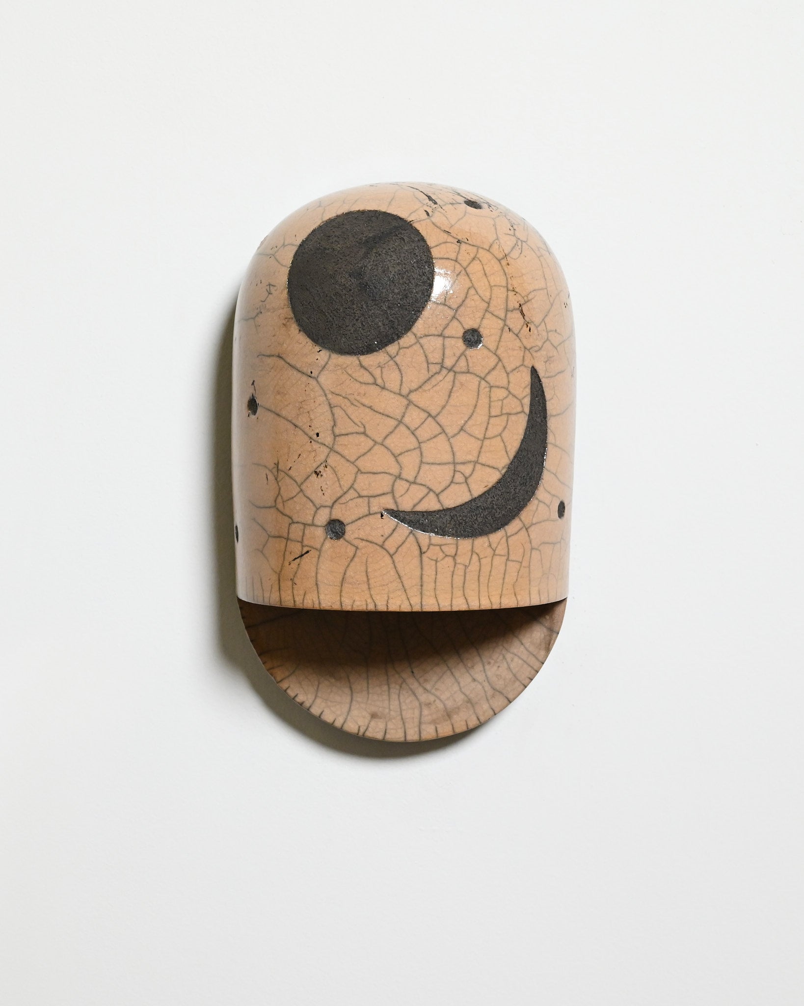 This is 1 of 4 sconces in the collection that was glazed with a White Crackle Raku glaze. The lamp was made using a red clay which gives the lamp a dusty pink color, and the carved designs were left unglazed which allows the clay to absorb the smoke during the Raku process, turning the clay black.
