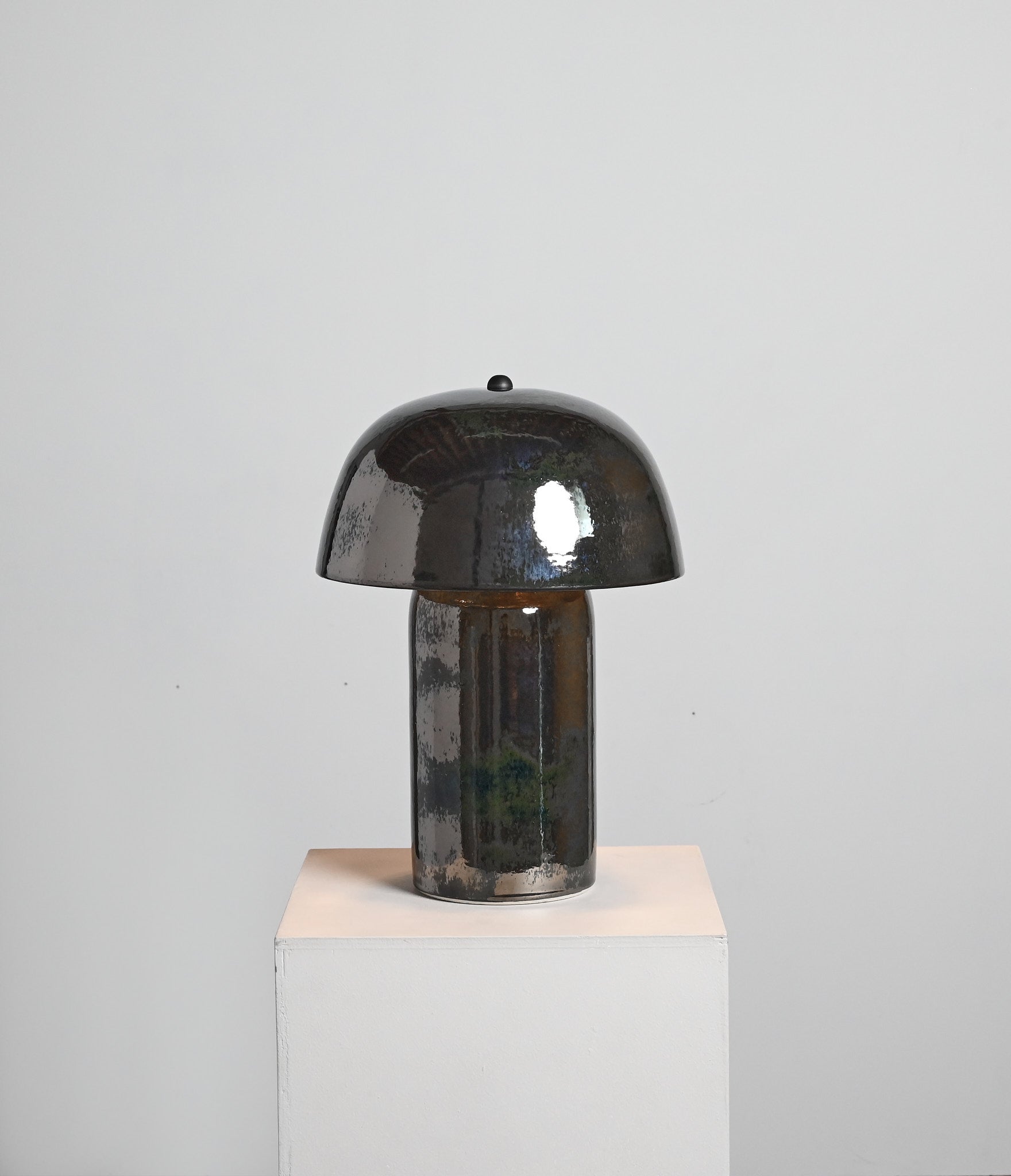 The Tera Lamp is Ceramicah’s signature table lamp, known for its classic silhouette, thoughtful proportions and earthy finishes. The Dark Chrome finish is a glassy, reflective gunmetal color with hints of oily blues and purples that come out when the lights are dim and vibes are high.